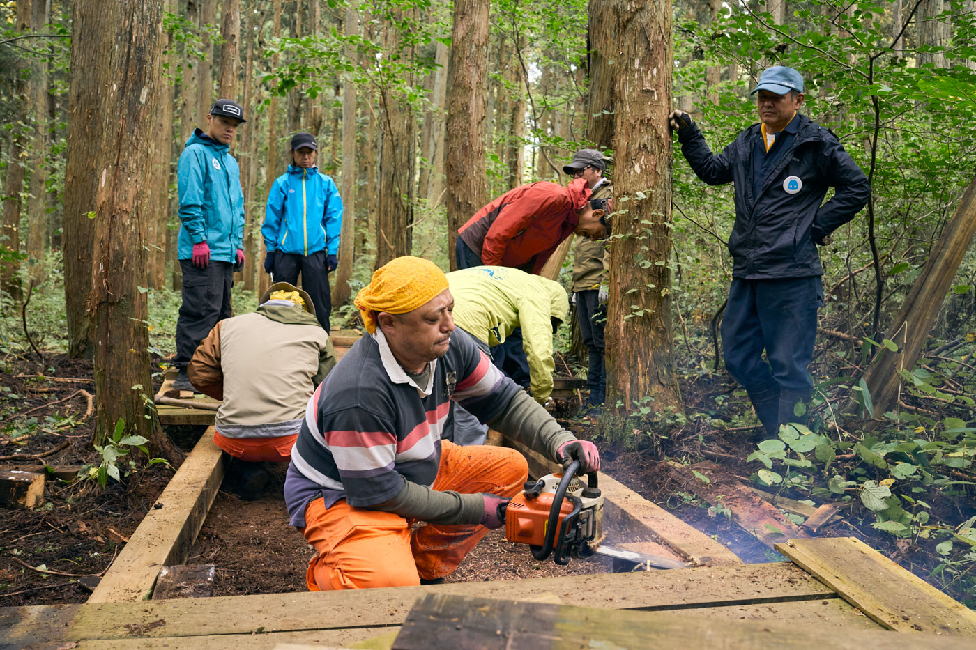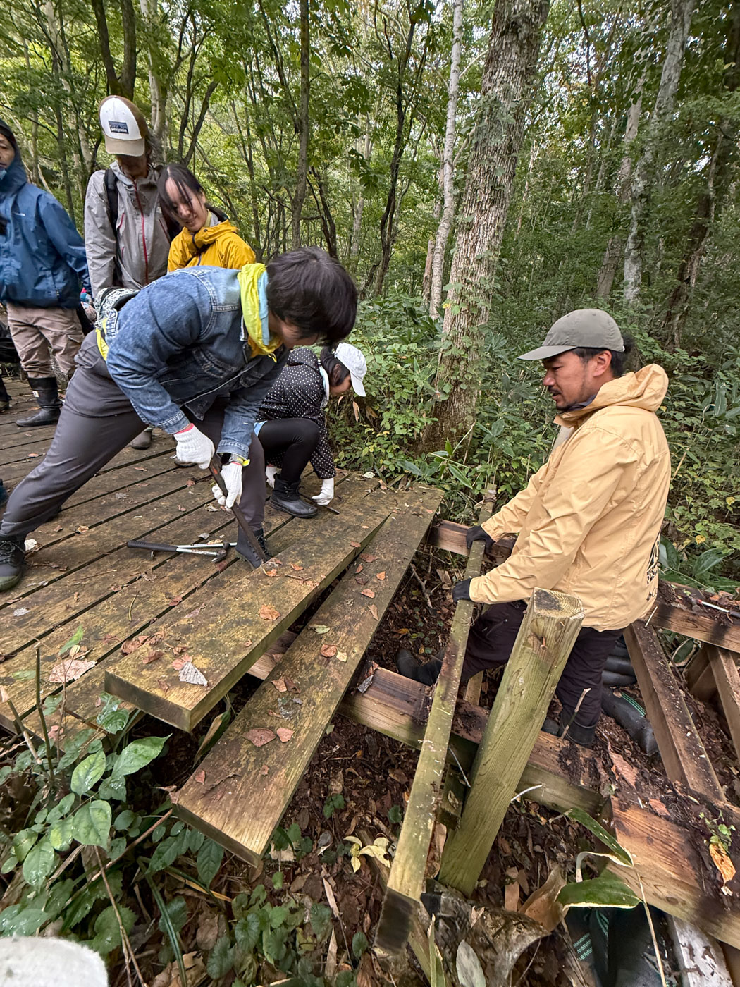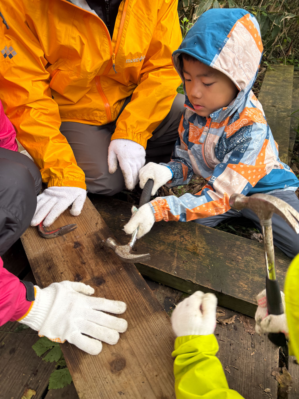 森の中では、木々のおかげであまり雨の影響を受けずに作業開始。大人も子どももみんなで作業をすすめていく。古くなった板を剥がして釘を抜いたり、運んだりした。