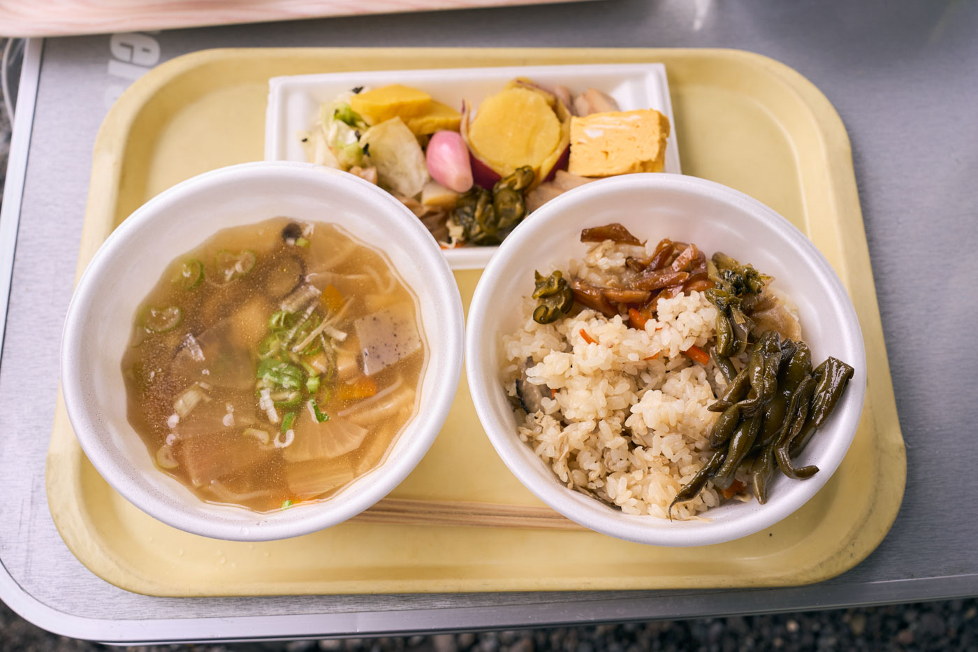 午前中の作業を終えて配られたステッカーと昼食を交換。舞茸の入った炊き込みご飯が優しいお味。そして、具沢山のお味噌汁やおかずもとても嬉しい。ご馳走様でした。
