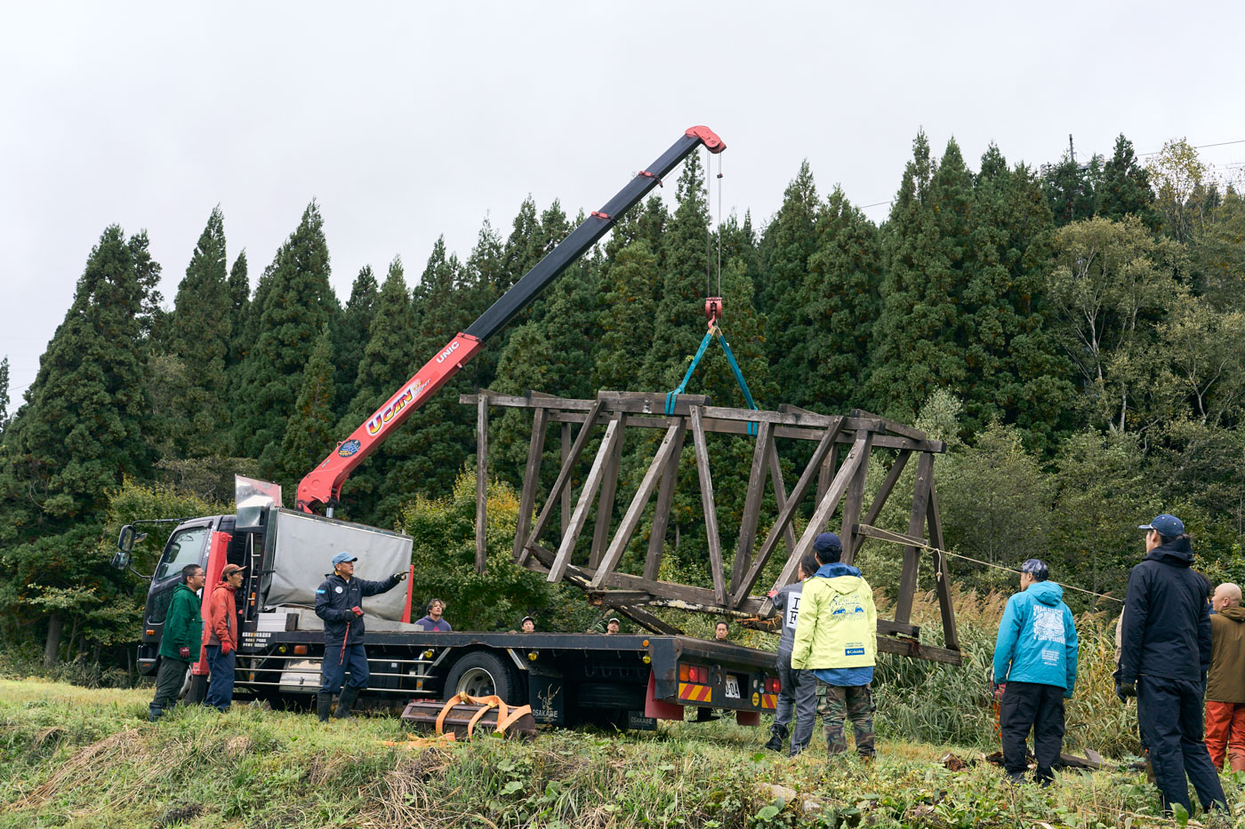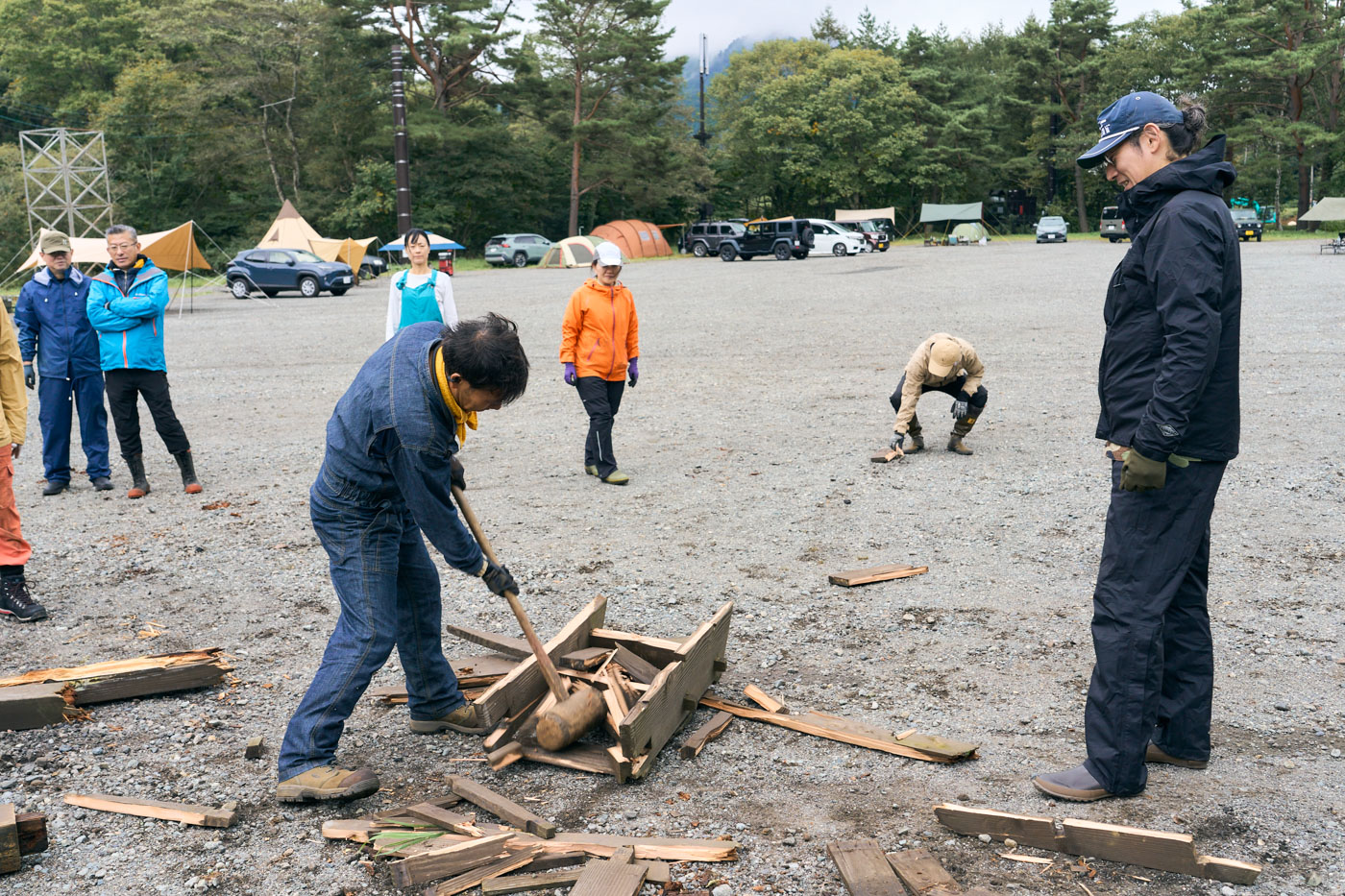 午後は作業とネイチャーツアーに別れて活動。作業組は、水車などを苗場食堂前まで運んで解体、そして端材と合わせて夜のキャンプファイヤーが組み上げられていった。