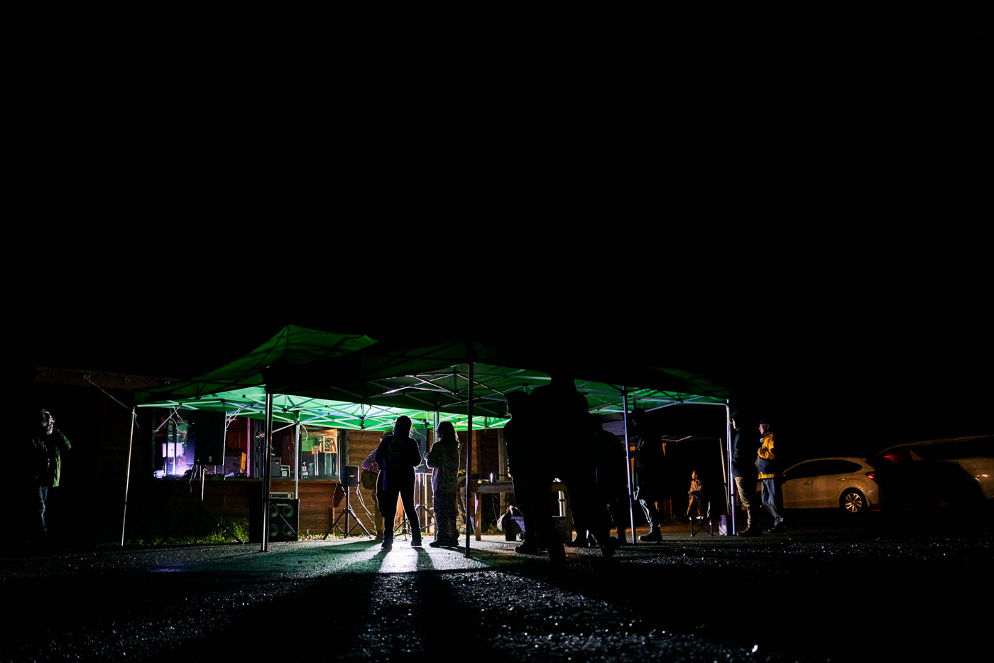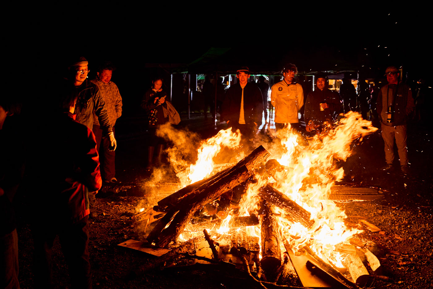 作業の後は、キャンプの用意をしたり苗場温泉 雪ささの湯(参加者には入浴券支給)でリフレッシュ。日が暮れて来ると3台のキャンプファイヤーに火が焚べられ、小雨が降る中でも盛大に燃えていた。