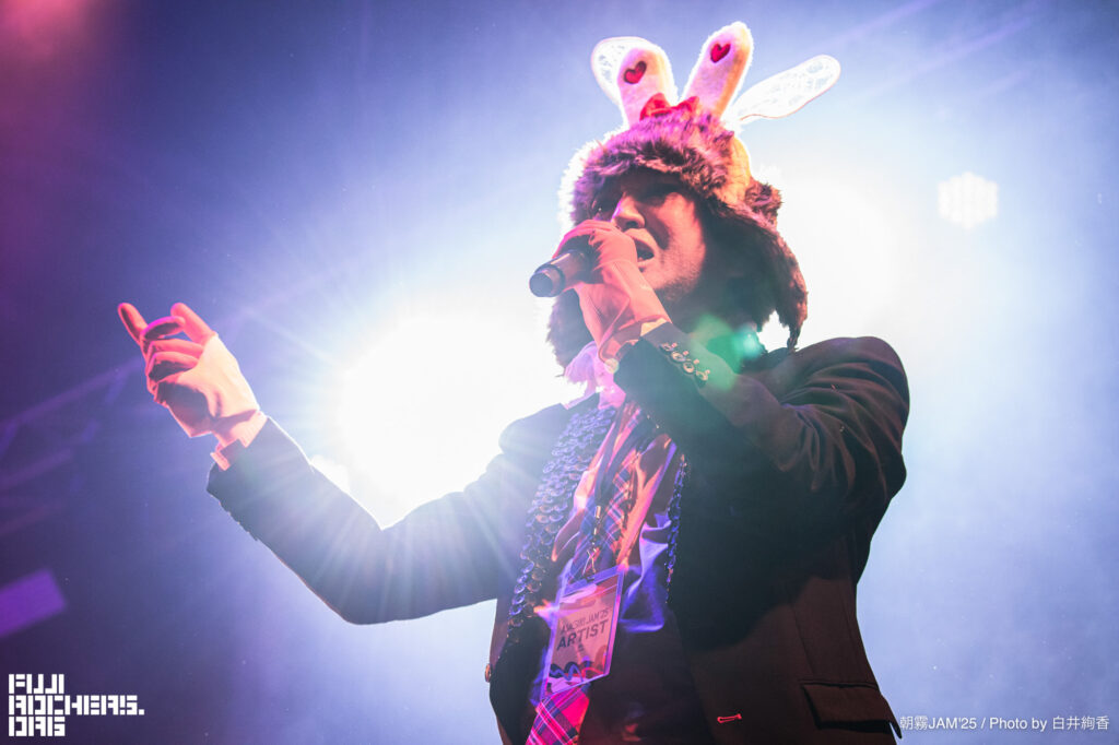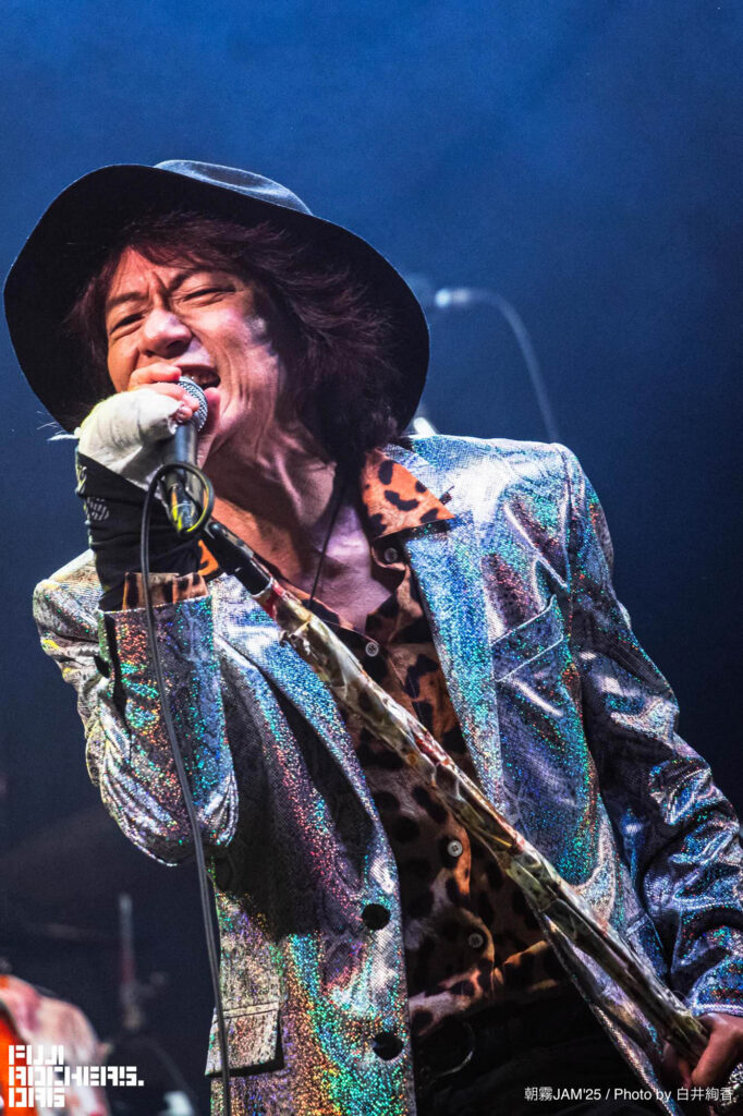 ここで満を持してダイアモンド☆ユカイのお出ましだ。ヒョウ柄のシャツにキラキラのジャケットを羽織り頭上には黒ハット、特製のマイクスタンドを振りまわすという、期待通りのかっこよさ。曲もドンピシャなバンドマン賛歌“ドカドカうるさいR&Rバンド”だ。盛り上がり必至のキラーチューン。藤井がざっくりとリフを刻み、マツシマライズが再びステージでソロをかましてロックスター臭をふりまいている。ユカイは終始ノリノリに歌い、ペットボトルの水を口に含んで客席に吐き飛ばす。往年のロックンローラーなパフォーマンスで魅せる。フロアから飛ぶ歓声に「朝霧最高だぜー!」とご満悦だ。
