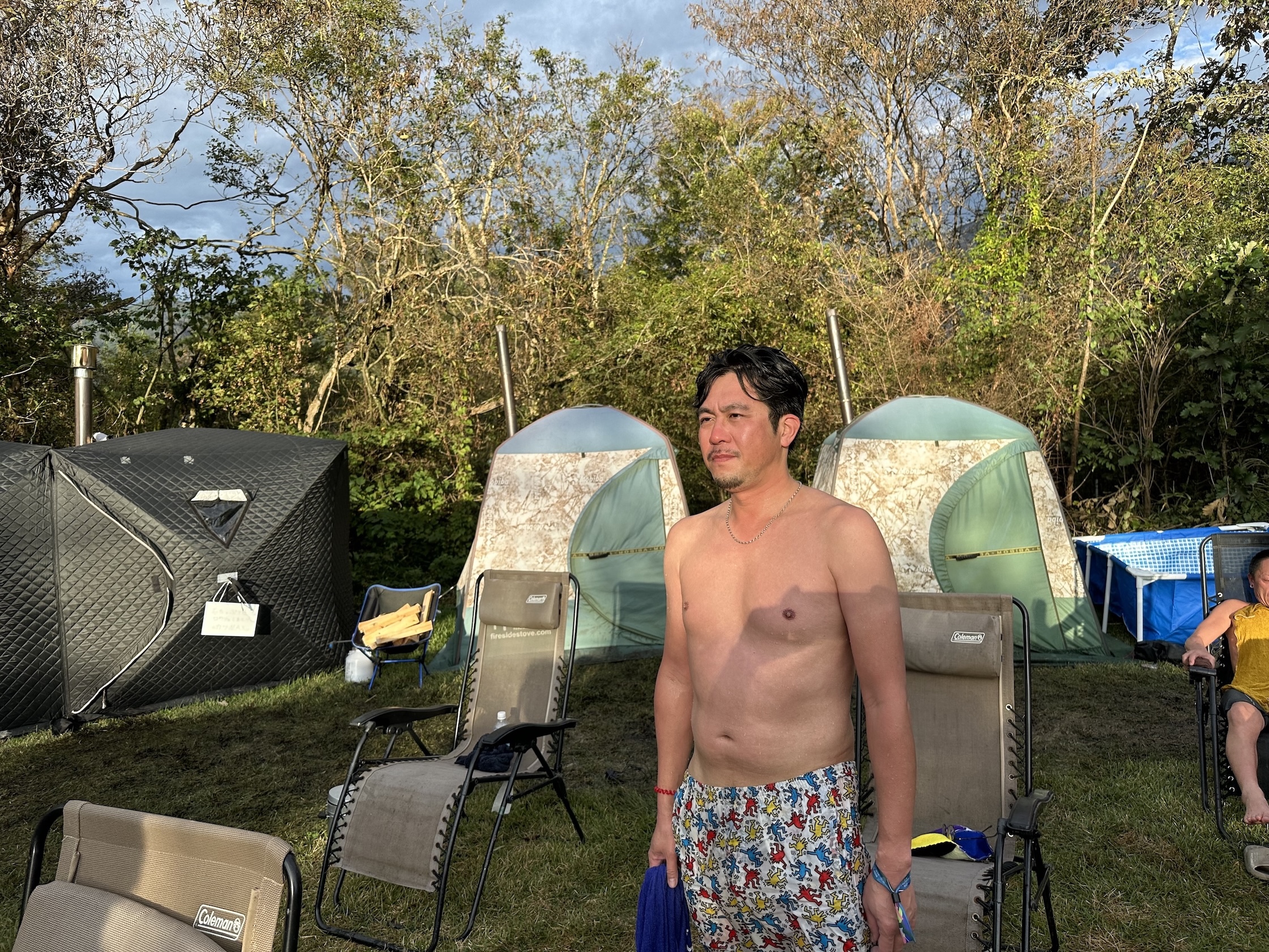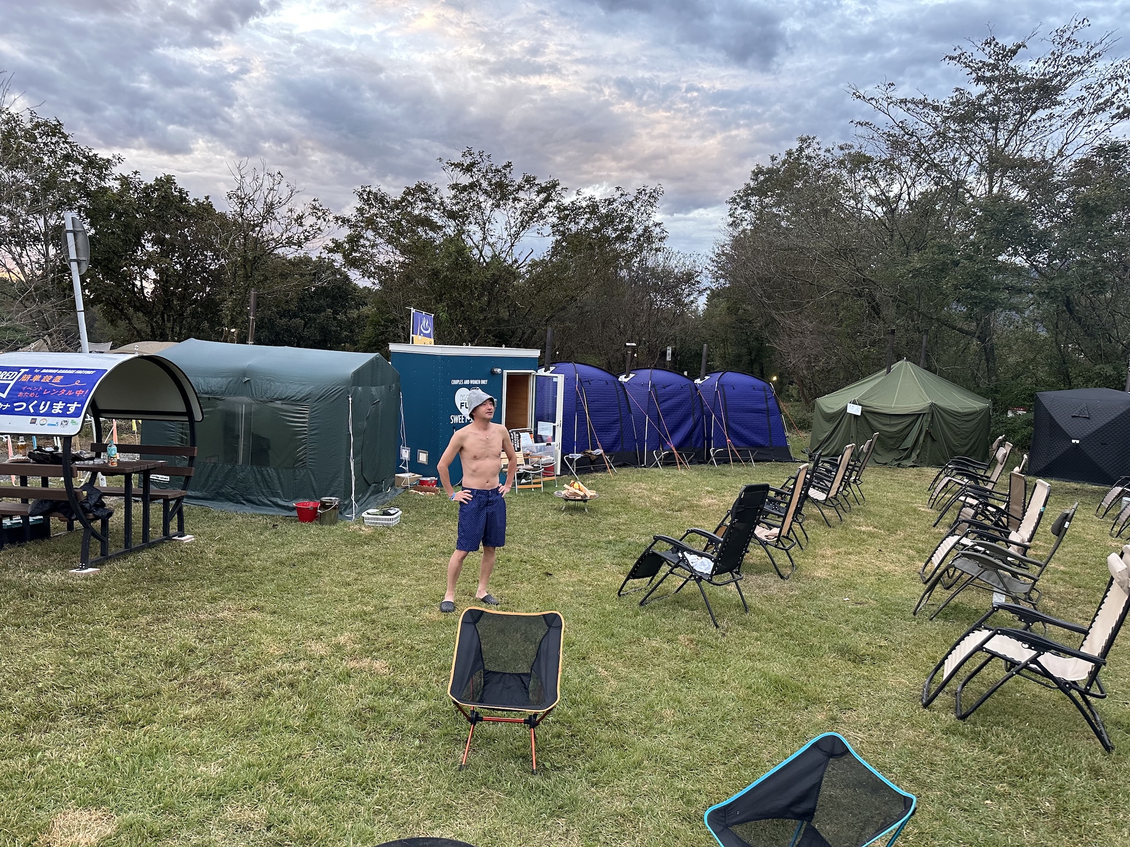 そして、なにより心を掴まれたのが早朝のサウナ体験です。朝一にも関わらず、ストーブにはすでにしっかりと火が灯り、テントサウナ内は抜群のコンディション。一杯のロウリュが、まるで“目覚めの音”のように響き、湿度が一気に高まります。昨日はしゃぎすぎて痛めた喉に、熱と蒸気が優しく沁みていく。飲みすぎた酒が体から抜け、高原の朝の冷気で固まった肩や腰が軽くなるのを感じます。