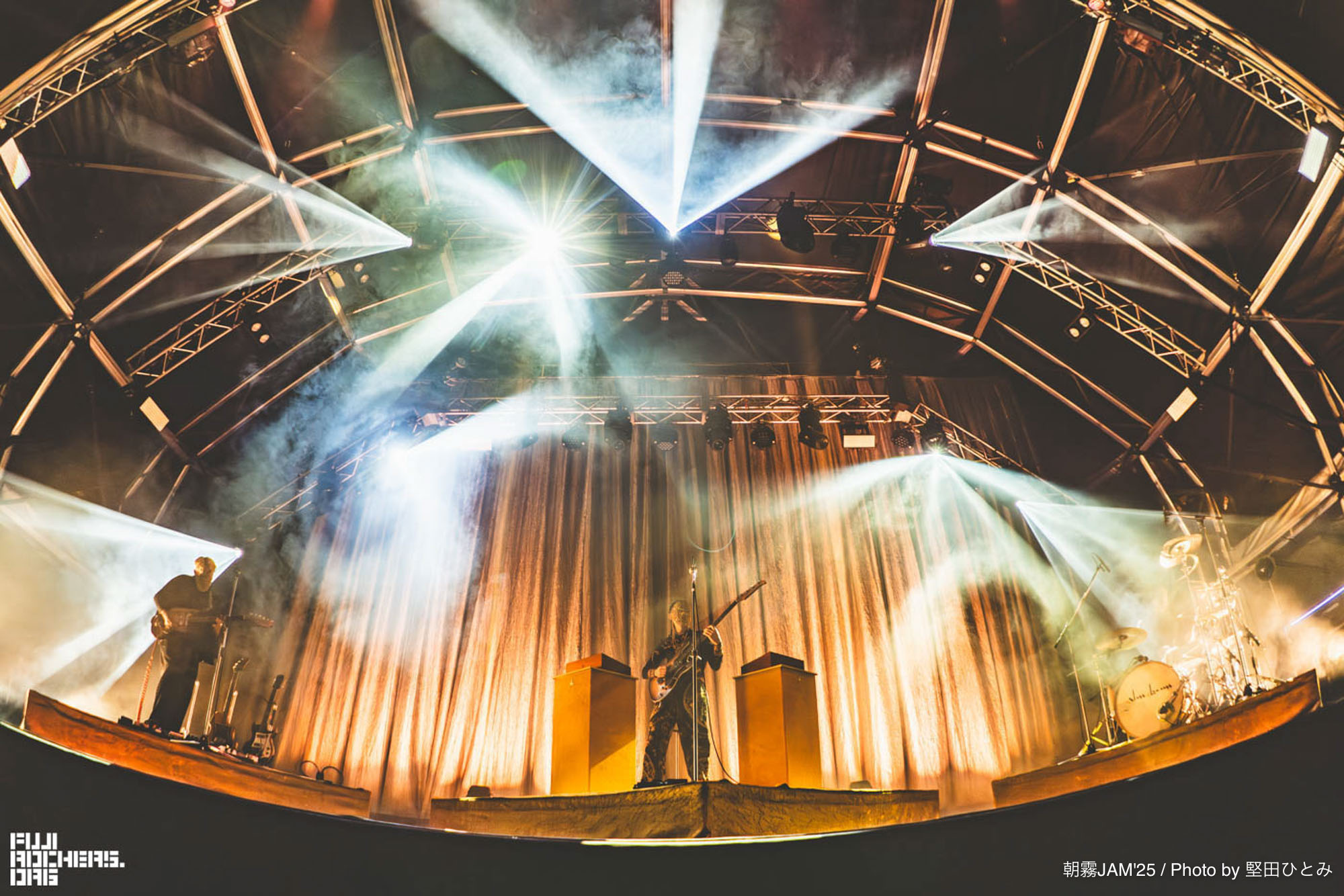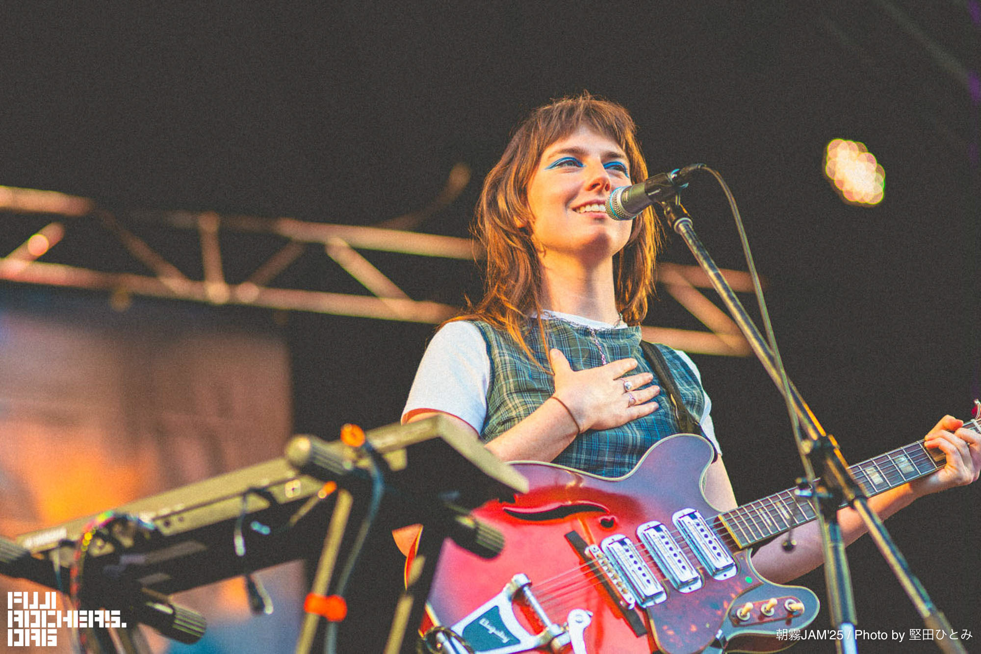 初日の15時半過ぎ。オーストラリアはメルボルンからやってきたシンガーソングライター、アンジー・マクマホンを観にレインボー・ステージへ。去年観たフジロックのステージにやられてからというもの、再会を待ち望んでいたお目当てアクトだ。深呼吸をしてからの開演はフジロックの時と同じだが、自然に囲まれた開放的な環境だからだろう。アンジーもバンドもリラックスし、音がゆったりとしたヴァイブスでいっぱいだ。「アンジーです。よろしくー」に「どうも!」、「日本最高!」と達者な日本語でのオーディエンスとのコミュニケーションもお見事。これが“Letting Go”での大合唱に繋がった。前日の夜、東京の初演来2度目の披露だという新曲の“Something Good”。アンジーの歌声から響く倍音が心地よい楽曲だ。ラストは“Pasta”で怒涛のロックンロールセッションを繰り広げて爽快に締めくくり。朝霧の地でより自然体になったアンジーに魅了されてしまった。