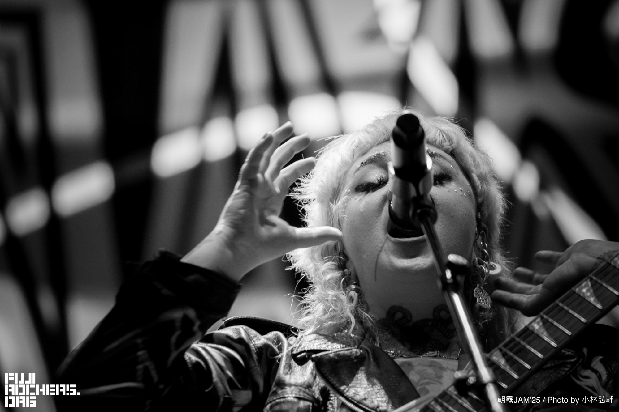 アニー達の熱いステージの余韻を引きずりつつムーンシャインへ移動。開演中だったのは見逃し厳禁のアクト、鬼の右腕だ。真紅の着物のような衣装に黒い傘を目深にかぶった4人組。メタルやプログレ基調にトライバルな民族音楽がのっかりフロアをガンガンに踊らせている。白いモコモコした鬼2体登場し、斧を掲げ、亀の甲羅の叩いて場の熱をさらに上げていくのだ。ミュージシャンシップの確かさとショウとしての完成度の高さにSLIPKNOTやBABYMETALを感じさせたと言ったら言い過ぎだろうか。あの場で一緒に盛り上がったあなたなら、きっとうなずいてくれることでしょう。次回はフルでロングセットを堪能したいものだ。
