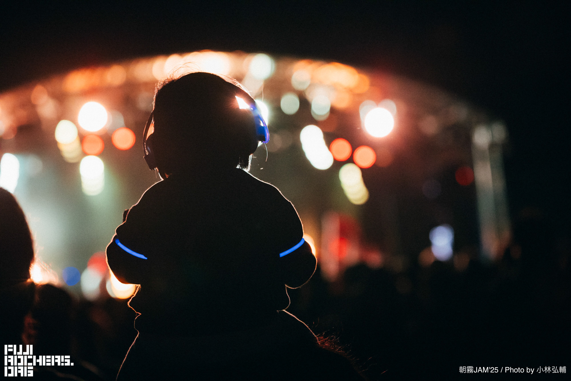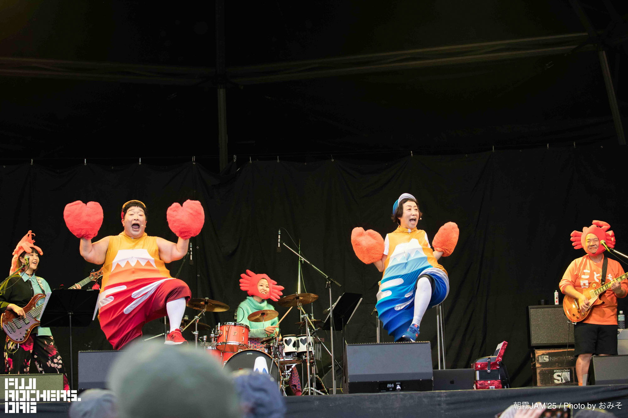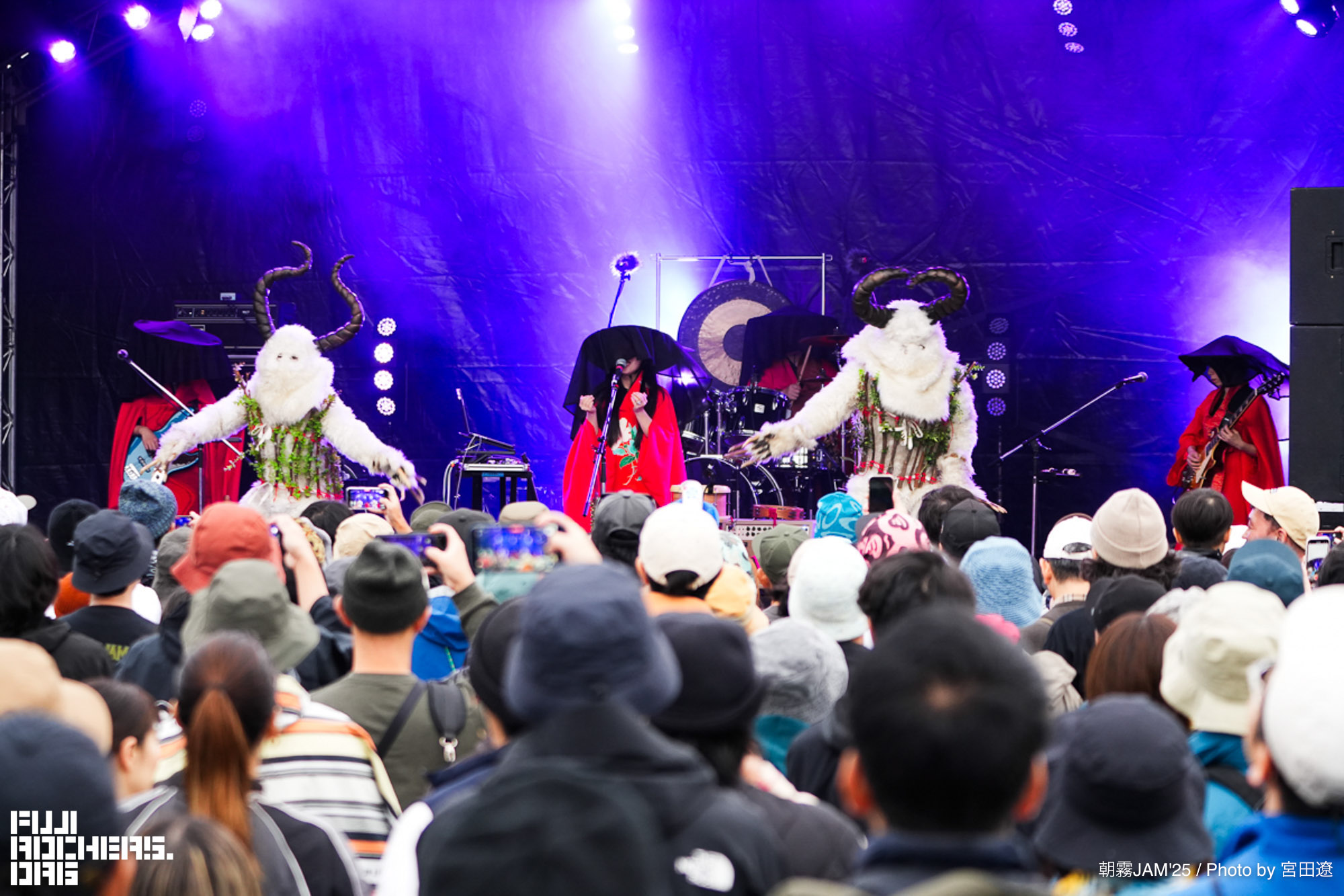 1日目はほとんど姿を見せなかった富士山。翌朝、日の出のタイミングで拝むことができた。山頂は雲に覆われていたものの、やはり壮観だ。朝ビールを飲み、『高原のシチュー屋さん』のクリームシチューを食べながら、朝霧恒例ラジオ体操の時間をゆったりと待つ。こんな時間がたまらず好きだ。実行委員長の秋鹿氏とケロポンズの二人が登場。朝霧JAMが25周年を迎えたことへの感謝の挨拶にはジーンときた。8年前の実行委員長の挨拶から生まれたという“ツイてるツイてる”を子どもから大人までみんなで踊りスタート。“こどもロック”ではドラムがドカドカぶっ放す。バックバンドのおなかペコペコズがロックしてるぜ。子どもたちの熱烈なアンコールに応えてまさかの“エビカニクス”2回演奏とサービスたっぷりに笑顔満載で終了。平和っていうのはこういうことだ。