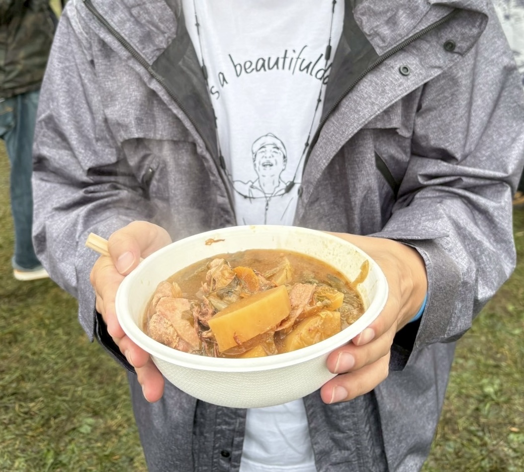 後は朝霧に来ると、ラジオ体操の前に必ず食べたくなる『高原のシチュー屋さん』のクリームシチュー。私はライスではなくパン付き派だ。身も心もあたたまる。そして『串焼きKOU』の鹿肉や猪肉、鴨肉など朝霧高原ジビエが煮込まれた巻狩鍋。少々の苦みと臭みがアクセントでパンチのきいたお味。これがポン酒と合うのよ。熱燗よりも冷酒の方がマッチベターなのでした。