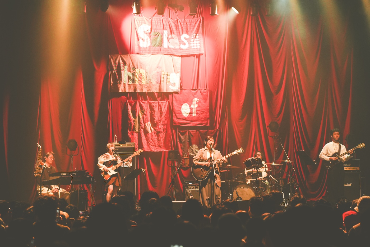 さらさのライブの魅力は、演奏だけにとどまらない。ツアーごとに刷新されるコンセプチュアルな背景装飾のデザインも、ライブ体験を構成する重要な要素だ。今回、ステージ背景を彩ったのは、一面に吊るされた真紅の幕と、コラージュアートを思わせる「Thinking of You tour 2025」の文字を配した装飾。オープニングナンバーである「“Thinking of You”が持つ温度」との相乗効果に加え、色数を抑えたミニマムでシンプルなライティングが加わることで、従来のさらさのライブとは一線を画す、この後の展開を予感させる印象を会場全体に与えていった。