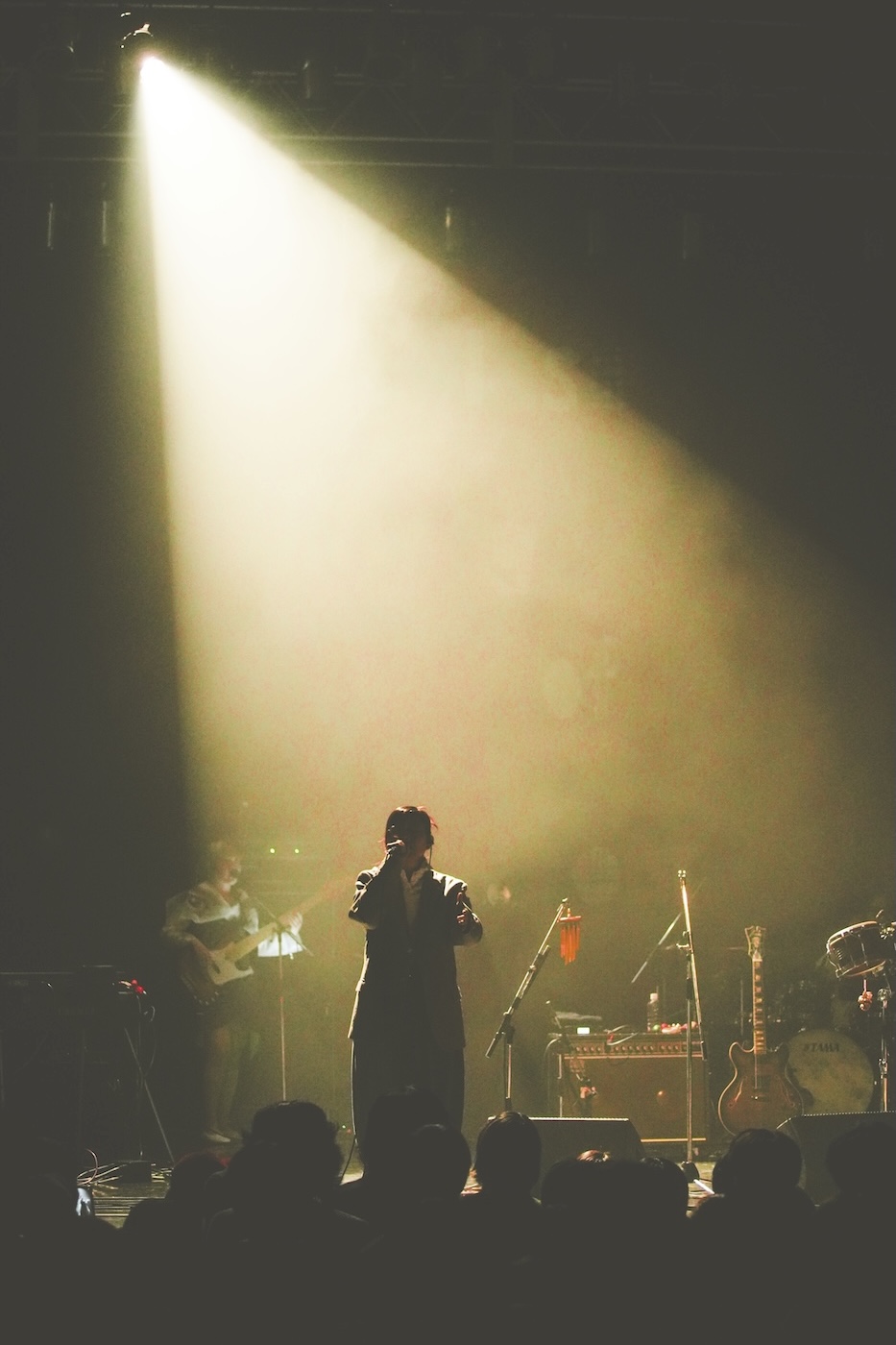 今回のツアーに参加している有元が作ったトラックをベースに制作された “青い太陽” は、そんな「ポスト・オーセンティック」を感じる曲であり、“Roulette” や様々なアーティストとのコラボ曲(“この街”や“Shakunetsu”、“WISE”など)の流れに連なっていると言える曲かもしれない。”青い太陽”は、乾いたソリッドなビートと、散文的な歌詞そしてそれを表現するヴォーカルワークとの対比が楽曲をキラリと光らせている。この曲で特筆すべきは、オオツカ氏のベースと松浦氏のドラムによるリズム隊の妙だったように思う。互いの領域を侵さないよう慎重に配置されることで生まれる「余白=無音」の絶妙なスペースこそが、この曲の硬質さと柔和さを両立させたグルーヴのベースになっていた。