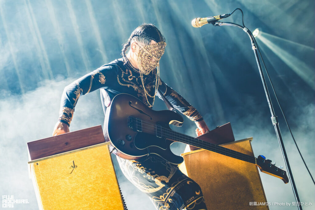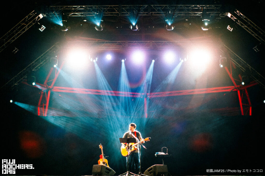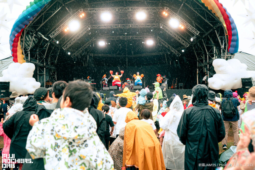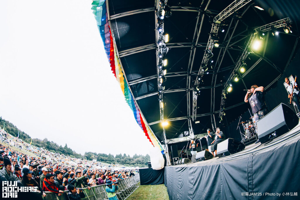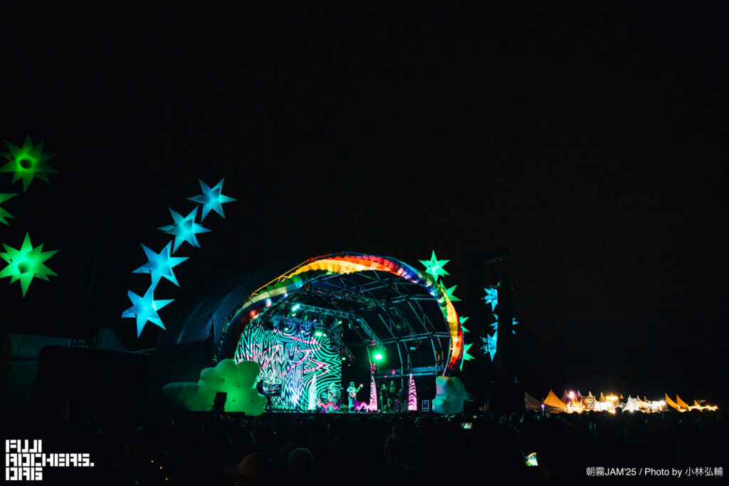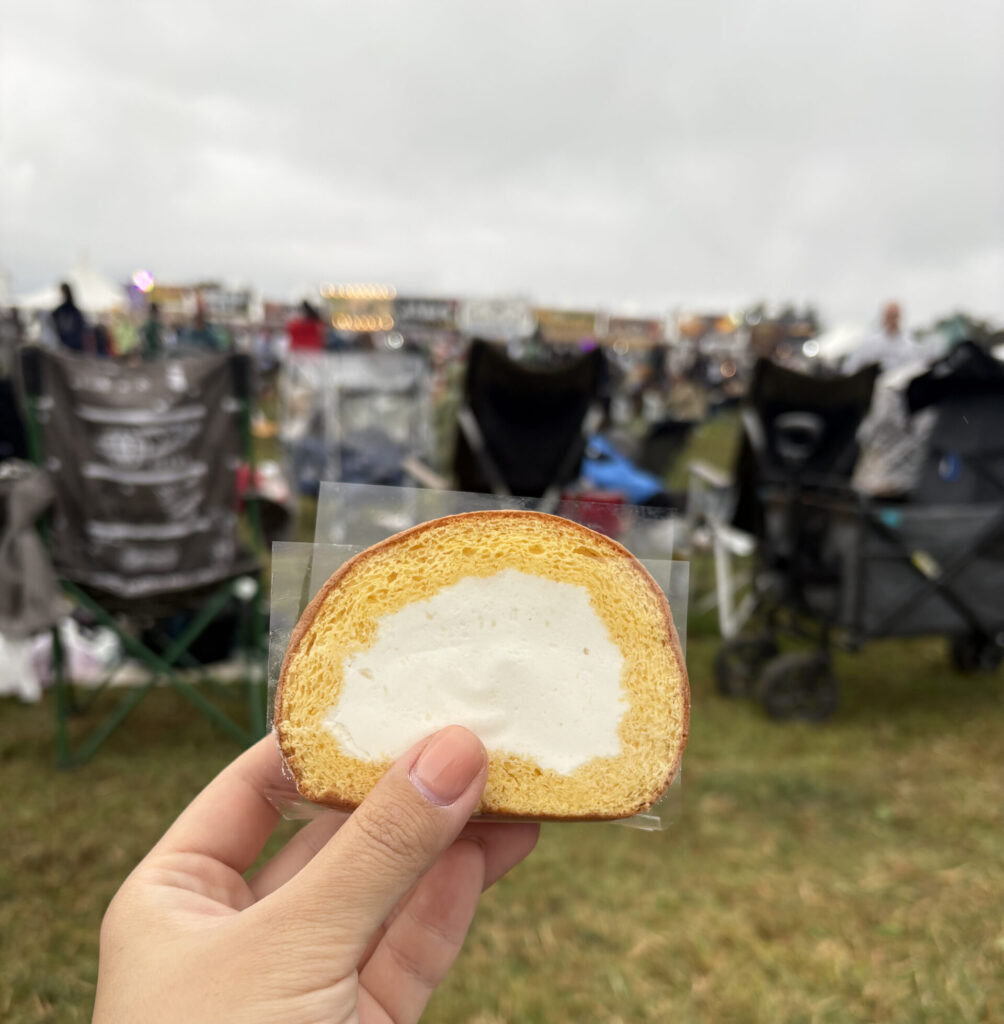 そのあとは、朝霧の牛乳と卵を使用したロールケーキをいただきました。これが絶品で、クリームの濃厚さと生地のふわふわ感、どちらもとても好みでした。MOONSHINE STAGEに移動していたら、ステージに鬼が立ってパフォーマンスしていてびっくり。初めての鬼の右腕は、世界観も演奏もステージパフォーマンスもバチッと決まっていて、今年の朝霧JAMのアクトの中ではかなり印象に残りました。