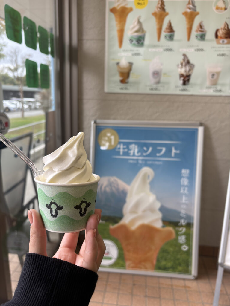 9時前には新富士ICを降り、マックスバリュでお買い物。お土産の下見とご当地食材確保のために道の駅朝霧高原へ、併設の「朝霧フードパーク」であさぎり乳業のソフトクリームをさっそくいただきました。