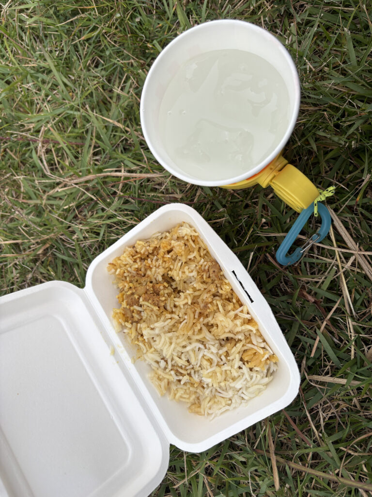 ある程度支度が済んだら、いよいよ会場へ。シャトルバスの待ち列も少なく、スムーズに朝霧ジャンボリーに到着しました。RAINBOW STAGEではYogee New Wavesが演奏をはじめたばかり。“Ride on Wave”のうねりに体は動き出し、朝霧に来てるんだなぁということを実感。その後、会場グルメ1発目として、流しのビリヤニのチキンビリヤニをいただきました。