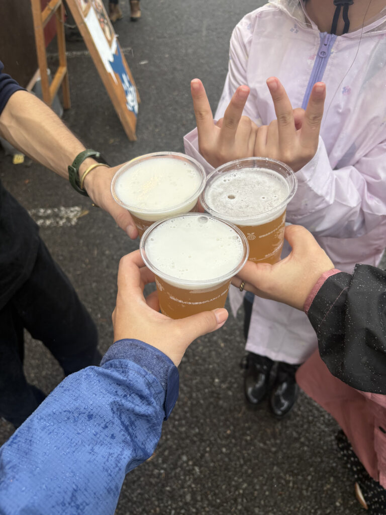 このまま会場に戻ってもよかったけど、ゆっくりと過ごしたくなった我々は再びバスに乗り、ふもとっぱらへ。売店で限定ビールを買ったり、キッチンカーで売っていた玄米酵素おにぎりを食べたりしました。