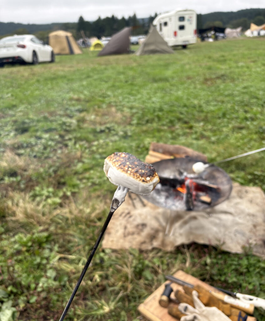 キャンプサイトでは、昼の焚き火にチャレンジ。Sちゃんが事前に用意していたマシュマロをみんなで焼いたところ、外はカリッと中はとろ〜りおいしい。ライヴも観たいけど、ふもとっぱらで過ごす時間も楽しいですね。