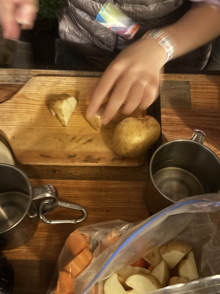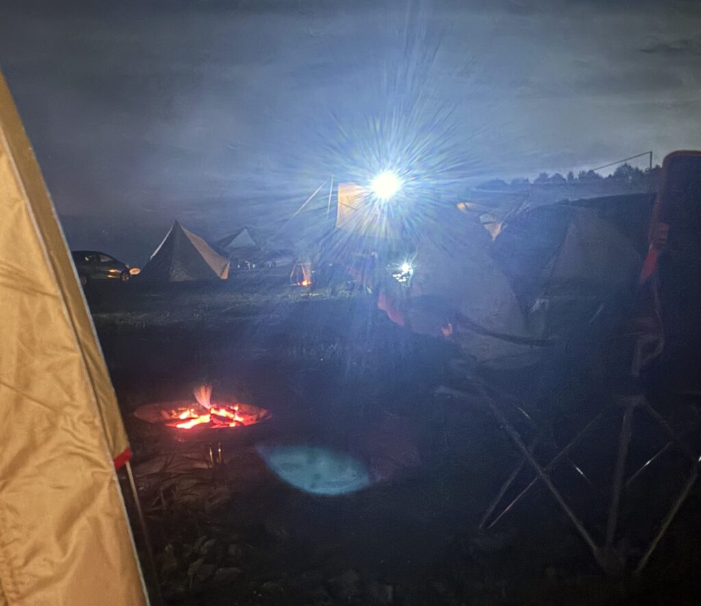 テントに戻り、一足先に帰っていたHさん&Sちゃんと合流。おふたりとも寒そうにしていたので、念の為に持ってきたストーブが大活躍です。さて朝霧JAM’25を締めくくる夜の大トリ調理を開始。Sちゃんにも野菜を切ってもらって、わいわい楽しい夜の時間です。