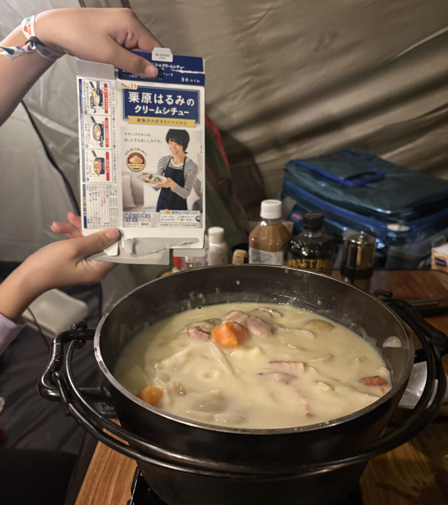 Nくんも忌野清志郎 ROCK’N’ROLL DREAMERSを観て戻ってきたところで、今夜のクロージングアクト(夕食)は、朝霧高原牛乳&朝霧ベーコンを使ったシチュー!ルーは「栗原はるみのクリームシチュー」なので、栗原はるみが実質のクロージングアクトです。寒い夜に野外で食べるシチューは本当においしい!体も心もあたたまりました。