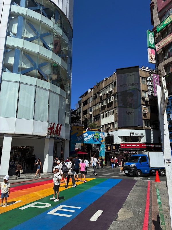 午前中は”台湾の原宿”こと西門 Ximen 町へ。台北でも随一の映えスポットの虹色にペイントされた道路が、最近塗りなおされたらしい。この時間になると、真夏なみにギラついた日射しが照りつける。街路に建つ温度計が「34℃」と示している。たまらずに、地下のMRTの駅からエスカレータを昇ったすぐの場所にある《紅楼 Hong Lou》へ。日本統治時代の八角形の赤煉瓦の建物だが、いまは土産物屋や雑貨屋が軒を連ねるマーケットになっていて、貴重なトイレ・スポットでもある。公衆トイレは近年の台湾を象徴するようにジェンダー・フリー仕様。入り口にある土産物コーナーを冷やかすつもりが、去年誕生したばかりらしいゆるキャラの〈紅福 Hong Fu〉がいろんな台湾名物とコラボしたキーホルダーに、ついつい手がのびてしまった。見た目はジバニャンだが尻尾をみるからに狐らしい。かつて、この場所に稲荷神社があった由来からだとか。