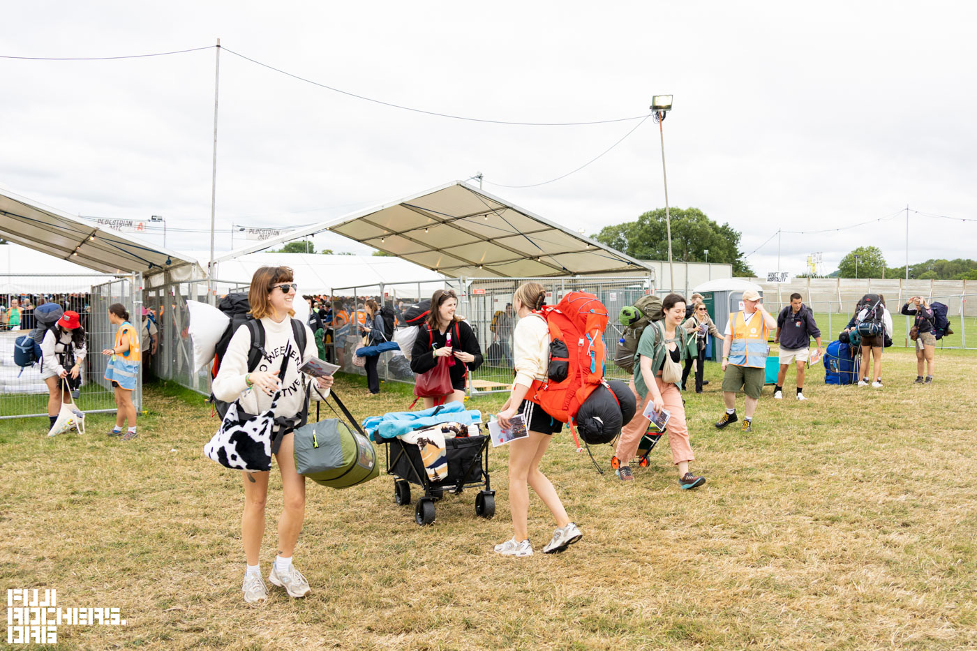 気温は約20度。朝10時ぐらいに入場ゲートを見に行くとキャンプ道具を携えた人々が続々と入場し、後から来る仲間や家族のために目印を高く掲げたり複数でひと塊りになったりしている。