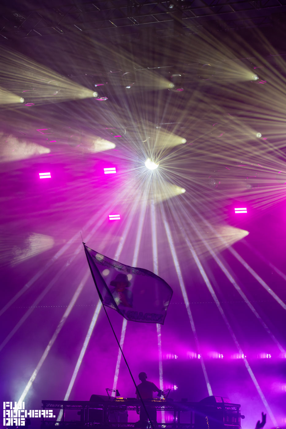 FUJIROCKのボードウォークを彷彿とさせる装飾の森を抜けて向かった先はWOODSIES。FOUR TETのステージは屋内タイプのフロア内に人がみっちり入った上に、みながみな踊っているので、なかなか中に進むのが大変だったが、ミラーボールに反射した光と翻る旗がとても印象深い空間だった。