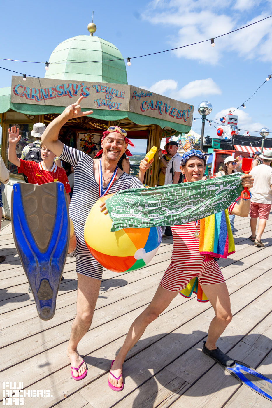 GLASTO ON SEAというエリアは特に遊園地のような印象のエリアで、パフォーマーが沢山!とてもノリのいい方が多く、私が会場内で持ち歩いていたFUJIROCKの手拭いを掲げてくださった。おしゃれな親子にも遭遇。