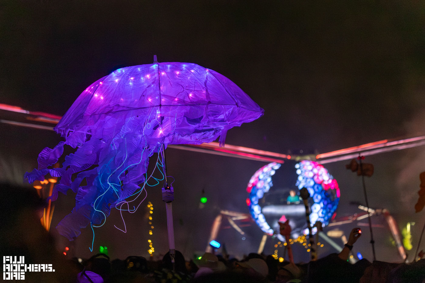 夜にはトンボのような装飾のARCADIAへ向かった。昼間通るととても広く感じる場所だが、夜になると前に進めなくなるほど人が集まり迫力に圧倒される。