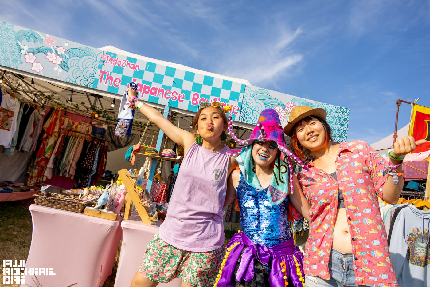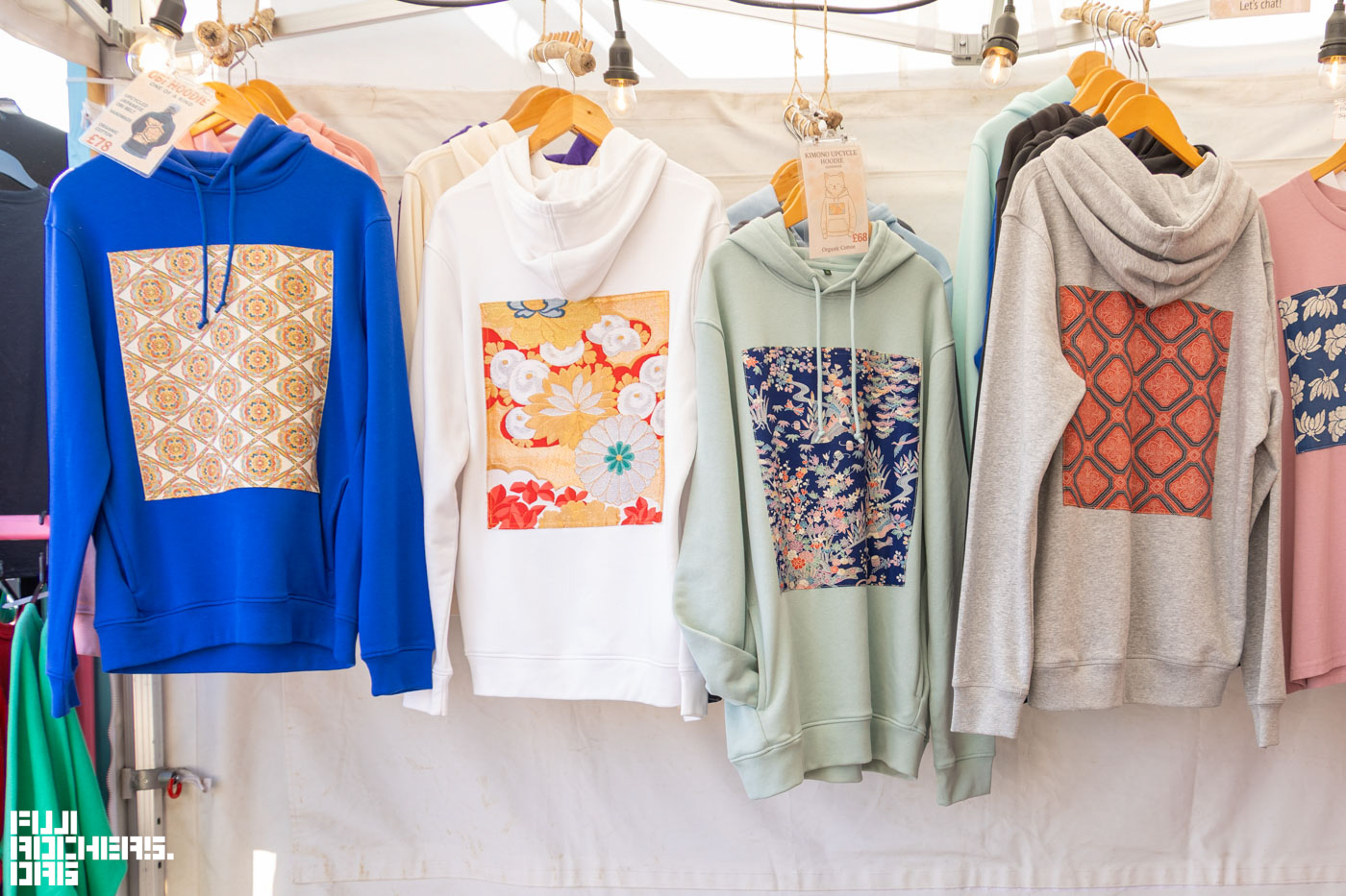 さらに会場内を散策していると車が塔のようなモニュメントが印象的なCARHENGEからPYRAMID STAGEへ向かうエリアで、日本人の方が開くSHOPを発見した。袋帯をフーディーに組み合わせたデザインのものやキャラクターものなどを販売していて、通常はブリストルのマーケットに出したり、フェスを回ったりしているとのこと。