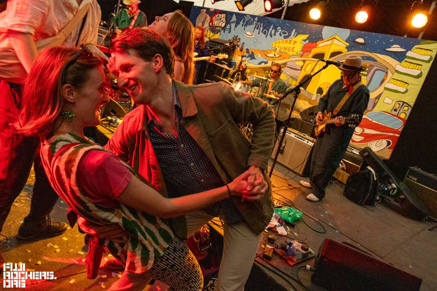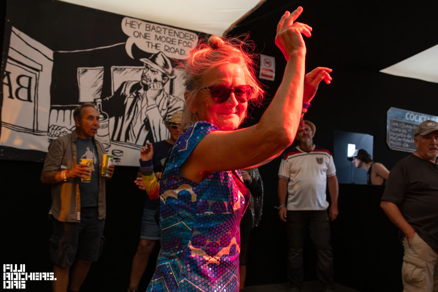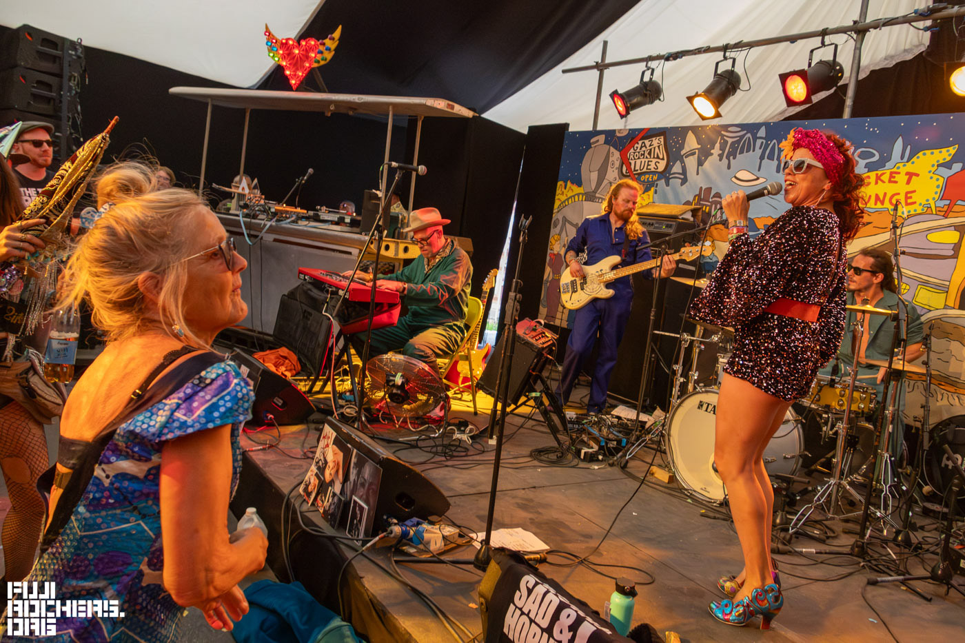 この日に特に印象的だったのは、THE ROCKET LOUNGEのステージ前で踊る白髪の女性。写真を撮ってもいいか尋ねるとOKしてくれた。「このステージは、姉妹のステージなのよ!」とのこと、サングラスまとめ髪からのおろし髪へのスタイルチェンジも素敵だった。そしてステージ中央では、女性の姉妹のバンドSISTER SUZIEがその場を盛り上げていき、バースデーの方を歌で祝うなど温かな時間だった。踊る人、お酒を酌み交わす人など、みな各々で楽しんでいてとても自由だった。
