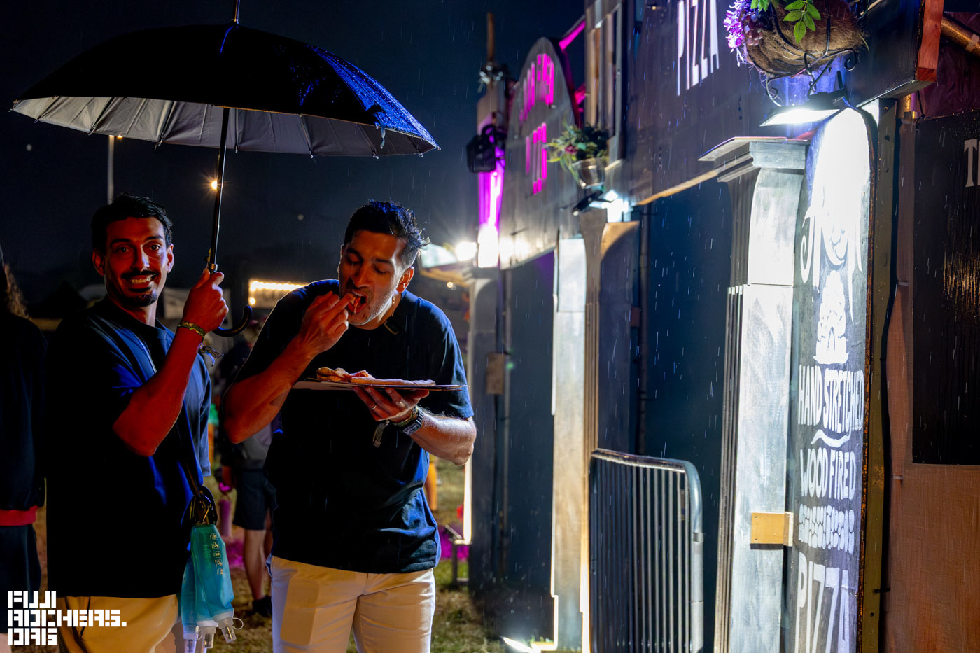 夜は降雨のタイミングもあったが、雨もなんのその。雨具を身につけたりそのままだったり。Glastonbury Festivalでは傘をさせるようで、ちらほらと傘をさす方の姿もあった。そんな中でピザを食べる友人に傘をさしかける微笑ましい光景に遭遇した。声をかけると、「ここのピザ美味しいよ」とお裾分けまでしてくださった。光るレインコートを着た女性も発見。雨の夜のフェスにマッチしている。なんとAmazonで買えるらしい。
