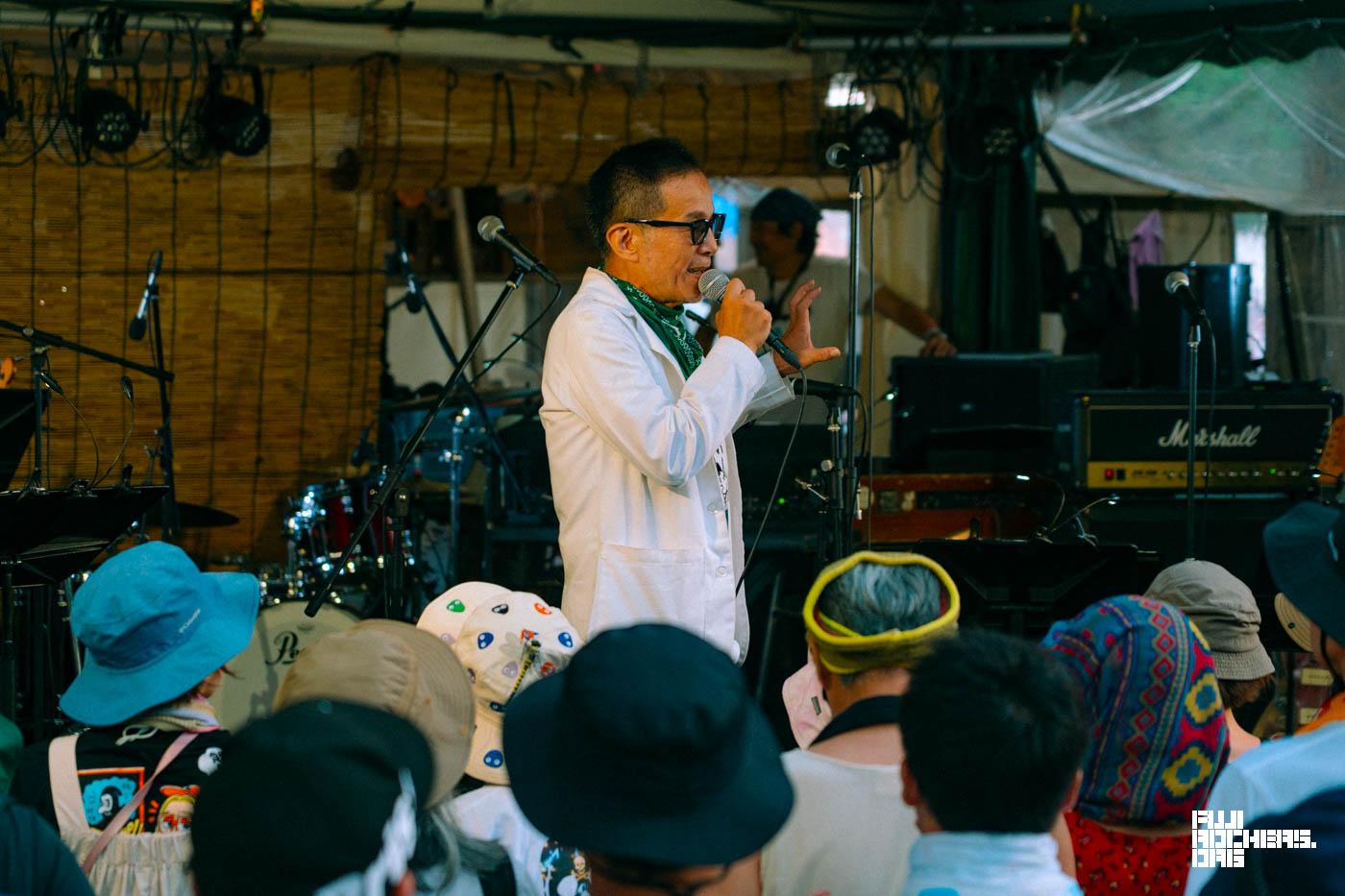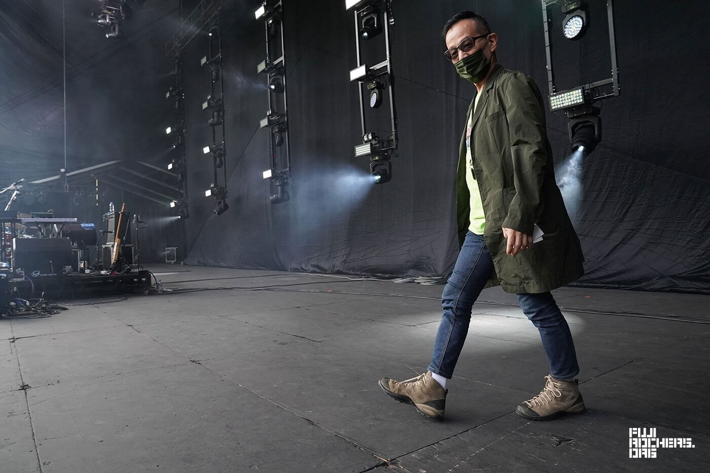 原島氏で前夜祭が始まり、グリーン・ステージで本番が始まるときも、忌野清志郎の歌『田舎へ行こう』と彼の声でことが動き出す。そして、最後、全ての演奏が終わってフジロックが幕を下ろすときにも、必ず彼がステージにいた。いつからだったろう、フジロック・エキスプレスでずっと続けてきたのがそれを記録すること。その前に彼とコンタクトして簡単に打ち合わせをしたりと、フジロックの始まりと終わりに必ず言葉を交わし、姿を目にしてきたのが原島氏だった。